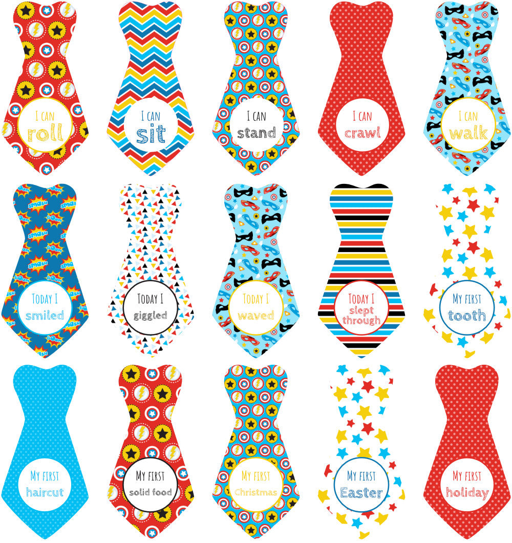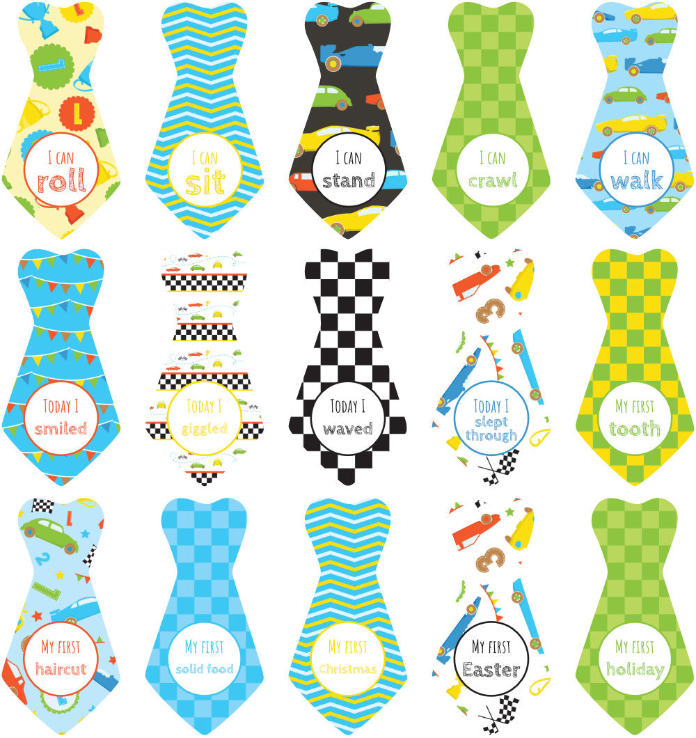 These developmental milestone stickers are the perfect addition to a baby shower gift for that new little baby boy and excited mom! There are 16 quality stickers, with a unique developmental milestone image printed on each one, and two different tie designs to choose from.